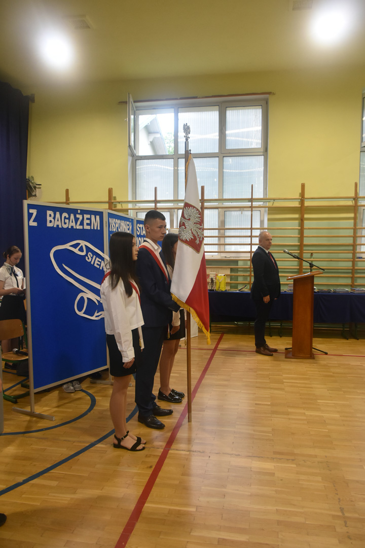 W dalszej części uroczystości ustępujący poczet sztandarowy przekazał sztandar szkoły nowemu pocztowi złożonemu z przedstawicieli klas siódmych. Następnie ósmoklasiści złożyli uroczyste ślubowanie oraz wygłosili słowa podziękowania skierowane do dyrekcji, nauczycieli i rodziców.