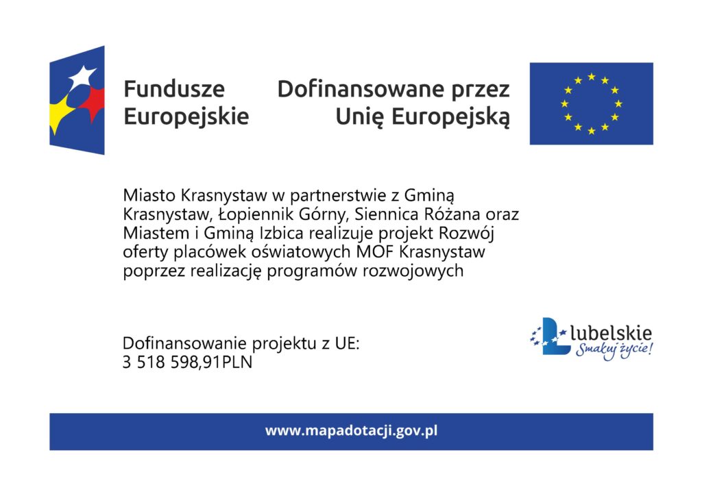 - Nazwa Projektu: „ROZWÓJ OFERTY PLACÓWEK OŚWIATOWYCH MOF KRASNYSTAW POPRZEZ REALIZACJĘ PROGRAMÓW ROZWOJOWYCH”