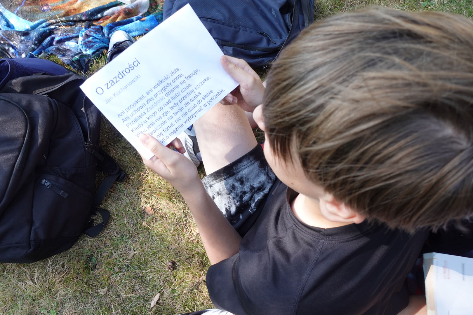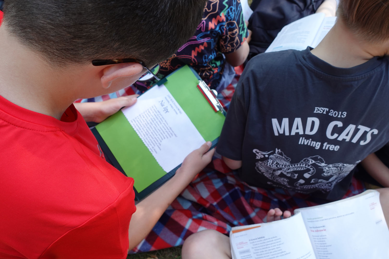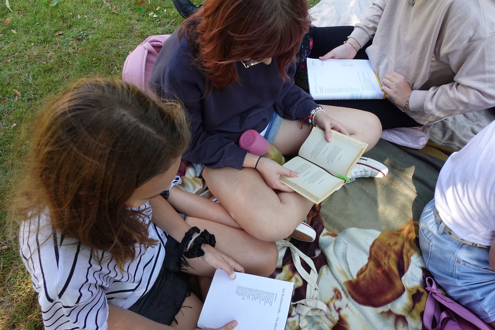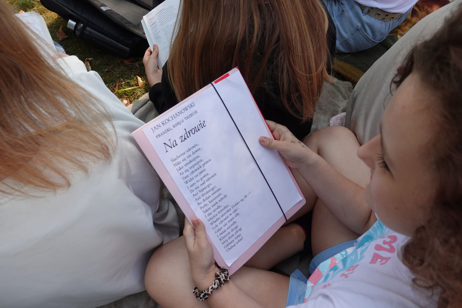W naszej szkole w tegoroczną akcję czytania włączyli się uczniowie klas siódmych i ósmej. Podczas lekcji języka polskiego, które odbyły się w plenerze, uczniowie mieli okazję poczuć się jak na pikniku w Czarnolesie. Pod koronami drzew czytali przygotowane wcześniej teksty Kochanowskiego. Największą popularnością cieszyły się fraszki.