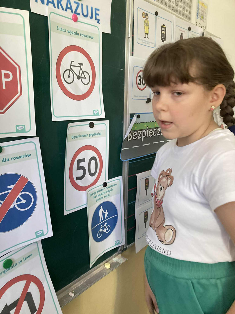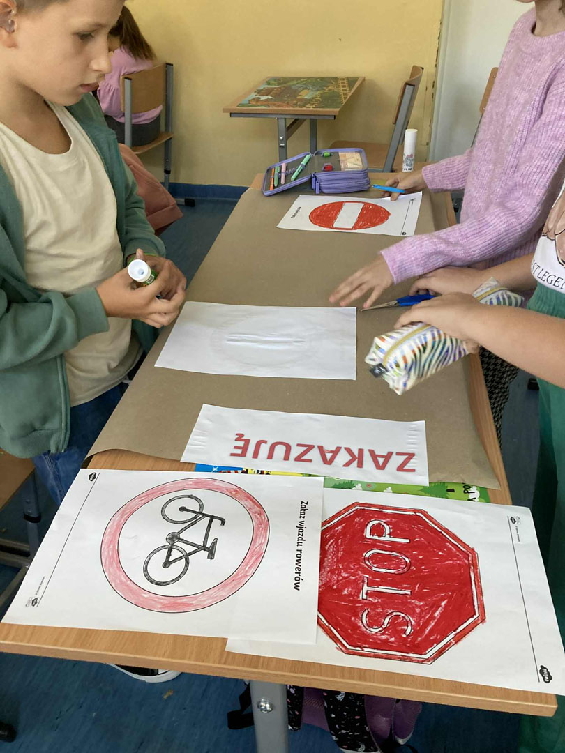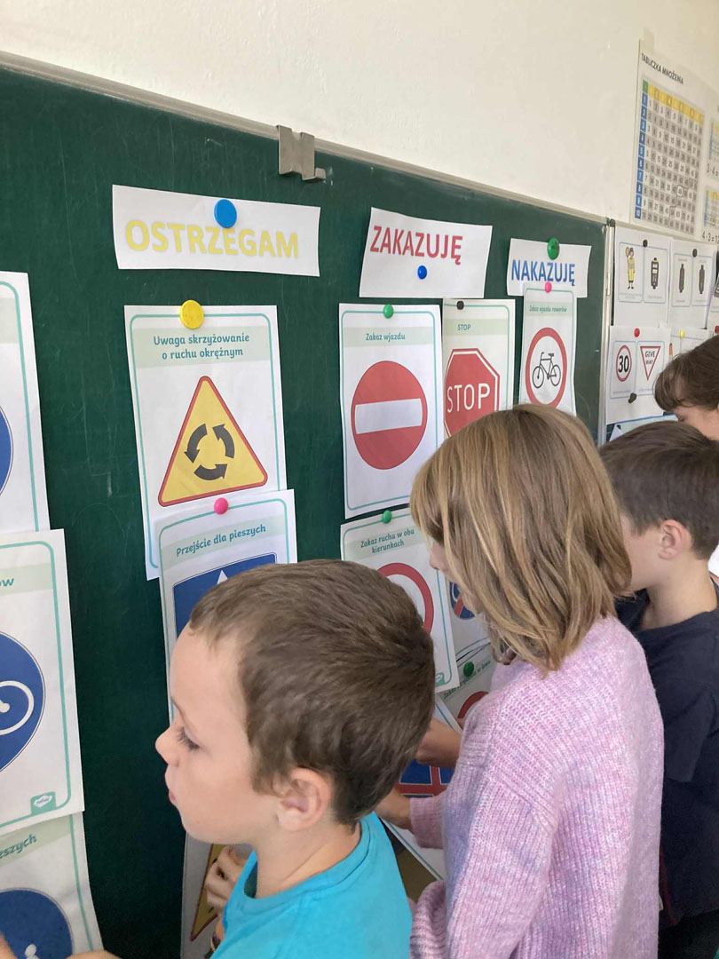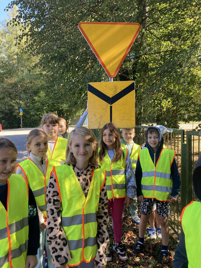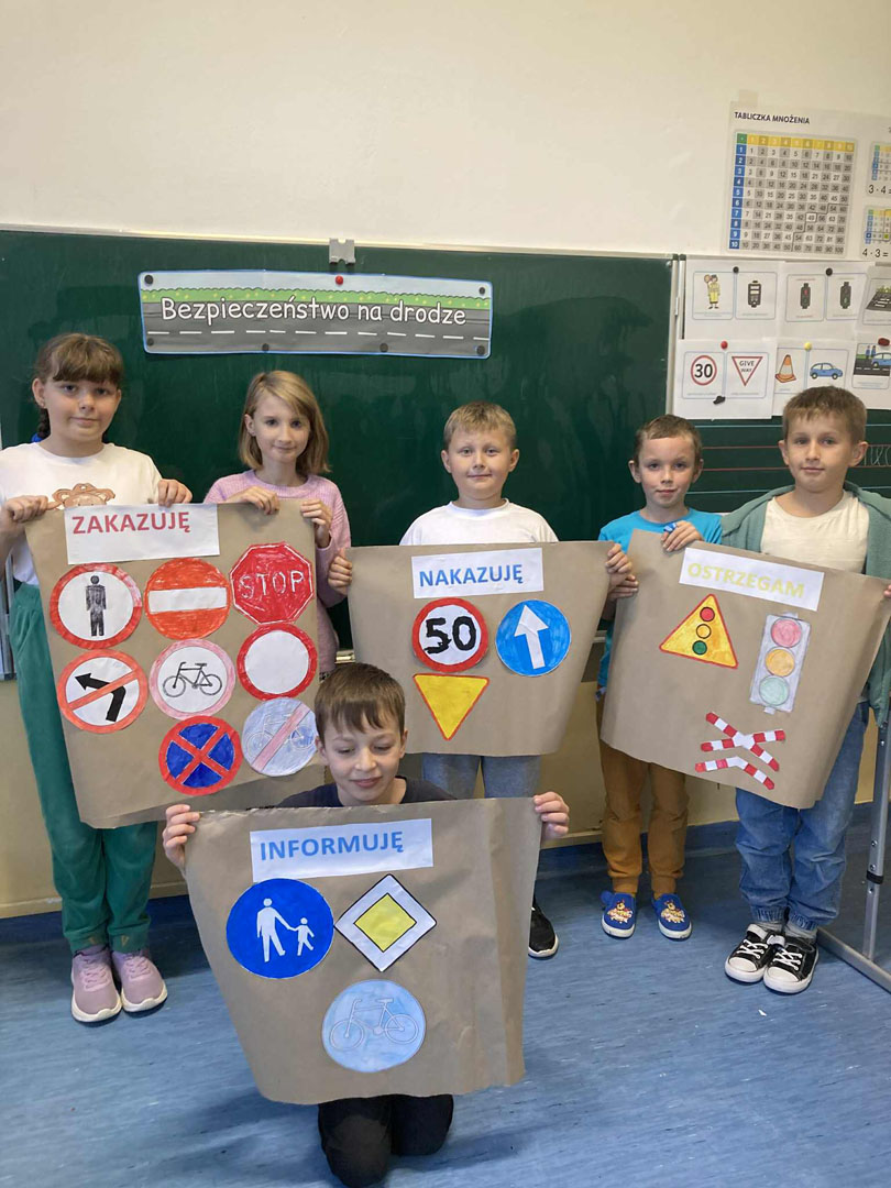 W ramach realizacji konkursu organizowanego przez Komendę Wojewódzką Policji “Odblaskowa szkoła” w czwartym tygodniu września uczniowie klasy IIIB uczestniczyli w zajęciach o bezpieczeństwie na drodze. Trzecioklasiści rozmawiali na temat sposobu przechodzenia przez jezdnię na skrzyżowaniu z sygnalizacją świetlną oraz w miejscu regulowanym przez znaki poziome i pionowe. Zapisywali zasady przechodzenia przez jezdnię za pomocą piktogramów. Wypowiadali się na temat obserwacji ze spaceru, własnych doświadczeń i filmów. Wykonali bardzo pomysłowe prace plastyczne, wykonali gazetkę o znakach drogowych i rozwiązali test wiedzy o ruchu drogowym.