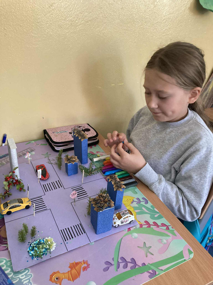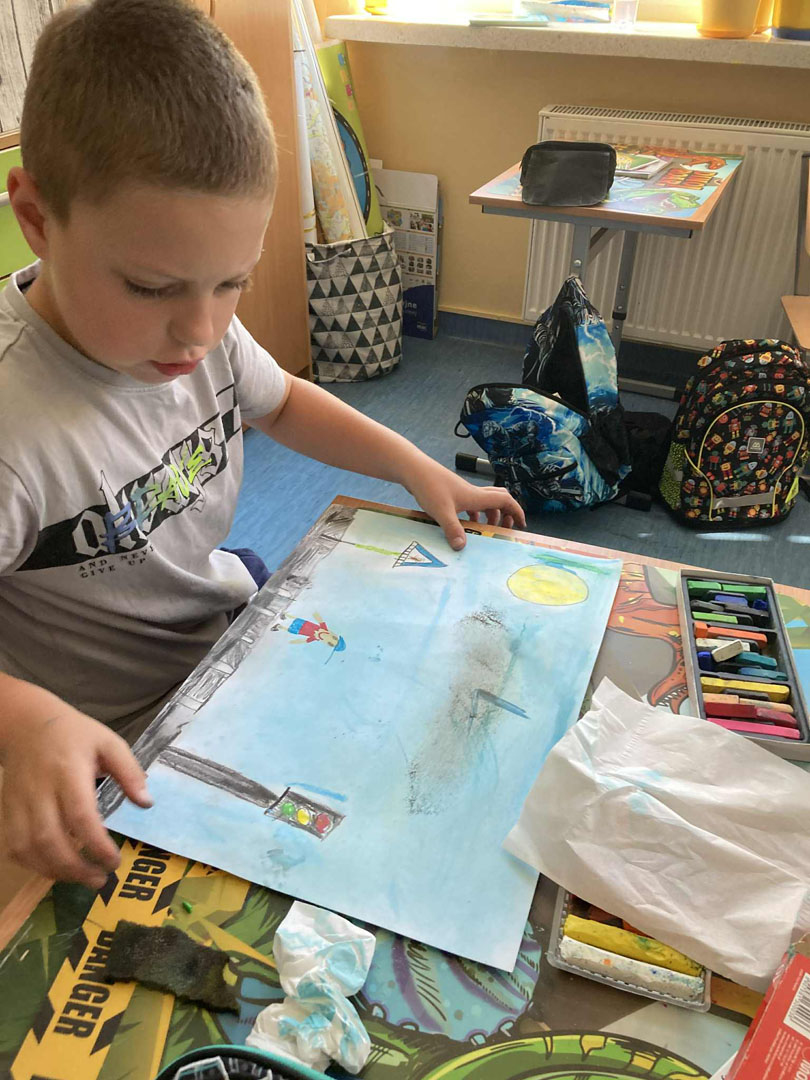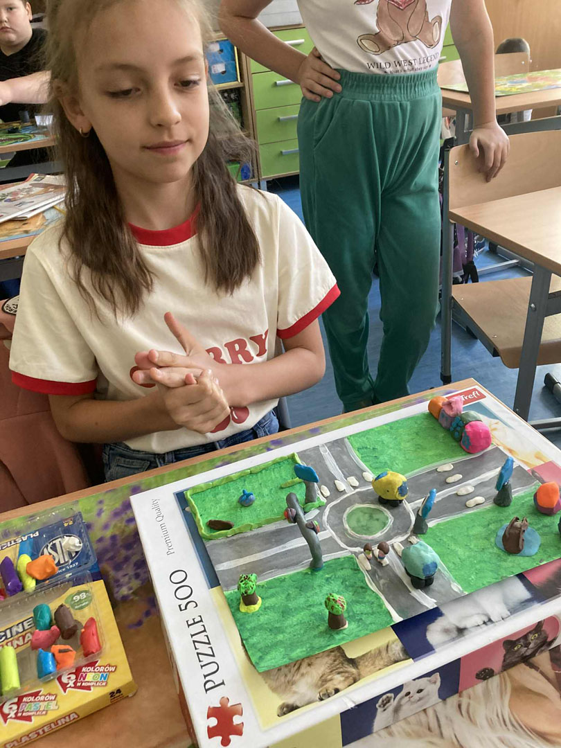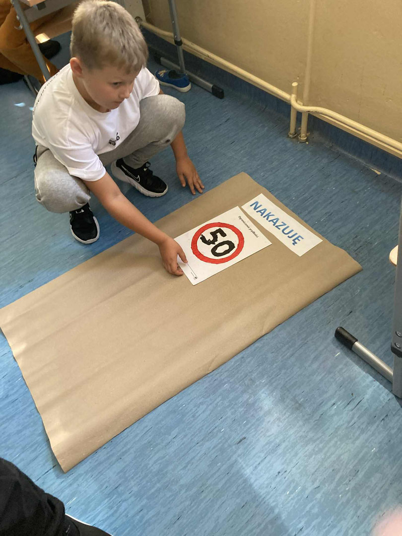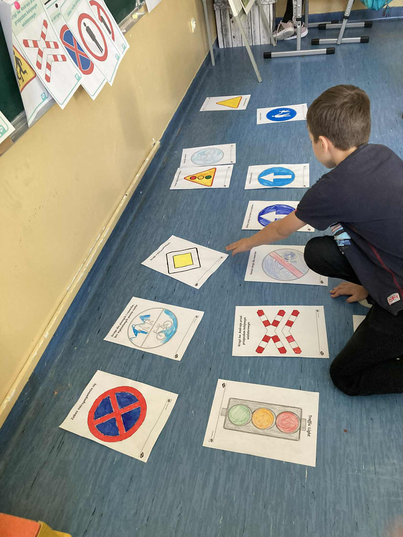 W ramach realizacji konkursu organizowanego przez Komendę Wojewódzką Policji “Odblaskowa szkoła” w czwartym tygodniu września uczniowie klasy IIIB uczestniczyli w zajęciach o bezpieczeństwie na drodze. Trzecioklasiści rozmawiali na temat sposobu przechodzenia przez jezdnię na skrzyżowaniu z sygnalizacją świetlną oraz w miejscu regulowanym przez znaki poziome i pionowe. Zapisywali zasady przechodzenia przez jezdnię za pomocą piktogramów. Wypowiadali się na temat obserwacji ze spaceru, własnych doświadczeń i filmów. Wykonali bardzo pomysłowe prace plastyczne, wykonali gazetkę o znakach drogowych i rozwiązali test wiedzy o ruchu drogowym.
