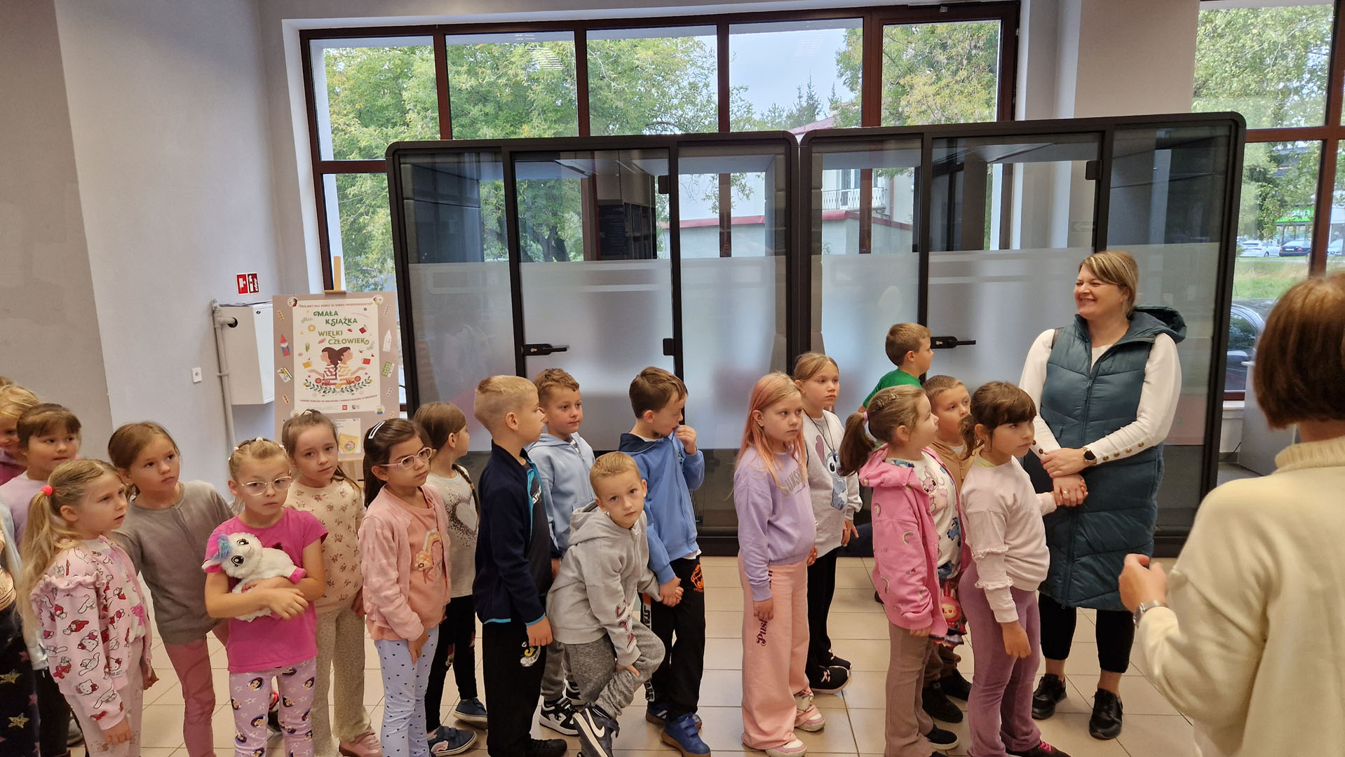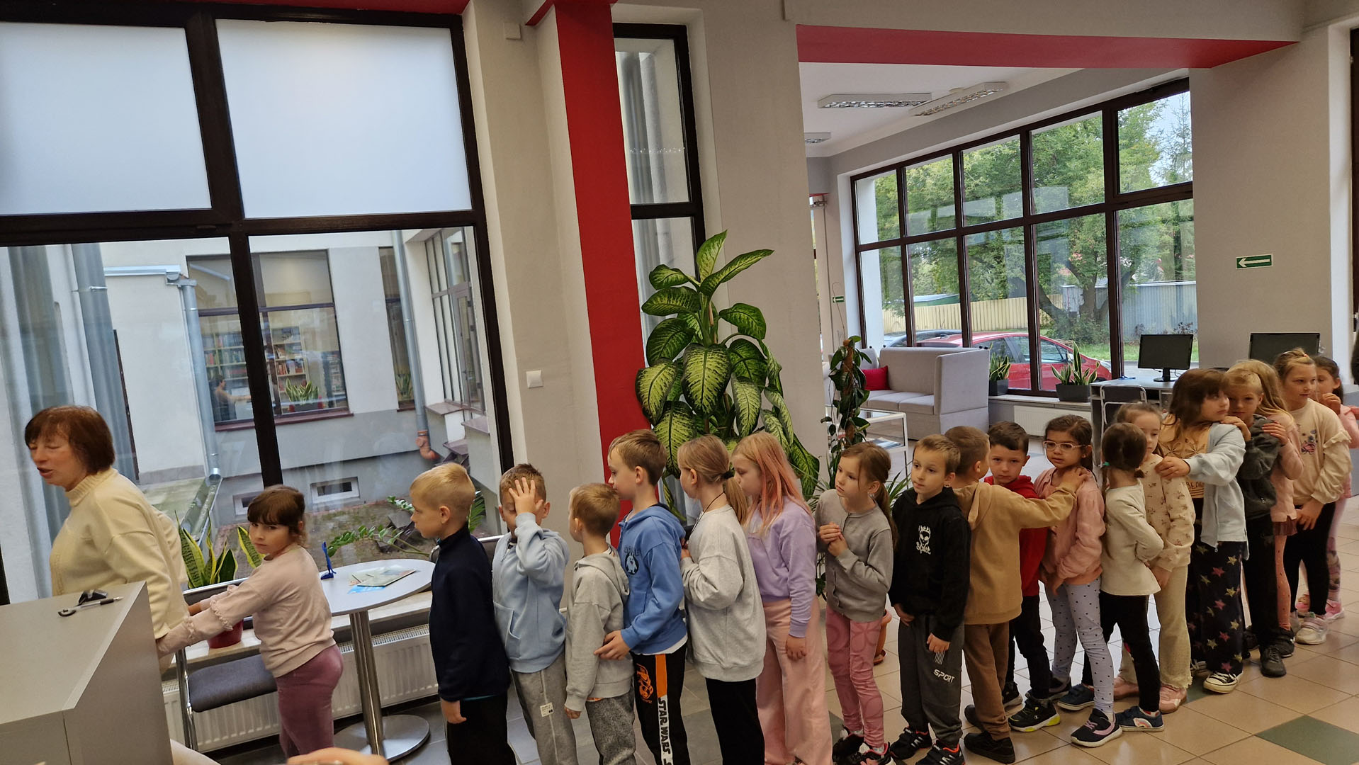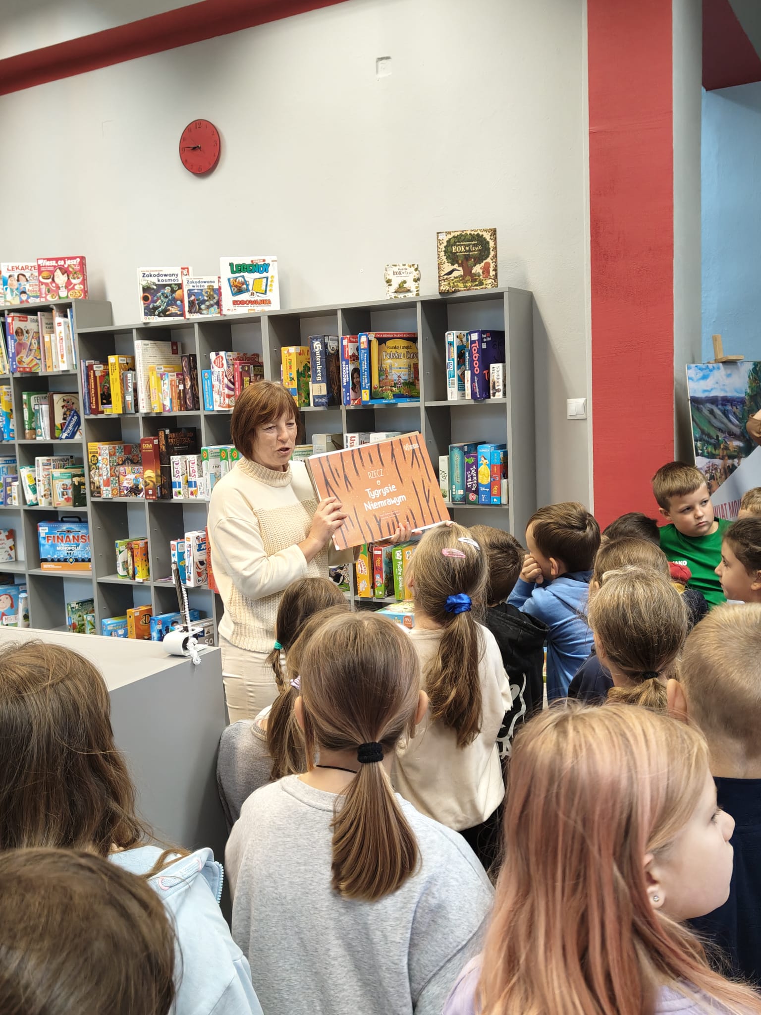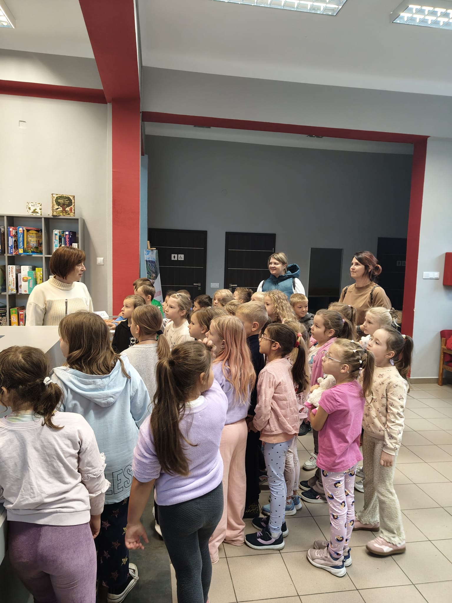 Pierwszym przystankiem była Biblioteka Pedagogiczna w Chełmie. Dzieci miały okazję zwiedzić to wyjątkowe miejsce i zobaczyć zakamarki, do których na co dzień nie można wejść. Żeby nikt się nie zgubił wśród wysokich regałów, pierwszaki utworzyły wesoły pociąg i wspólnie mknęły wśród regałów z książkami. Największe wrażenie zrobiły na nich książki, które po rozłożeniu kartek zamieniały się w zamek albo zaczarowany las. Dużą atrakcją okazały się też specjalne kabiny wyciszające, w których każdy mógłby spokojnie poczytać książkę lub czasopismo. Dieci dowiedział się że jest tyko dwie takie biblioteki w całym województwie lubelskim gdzie takie kabiny są. A obrazy w bibliotece? Uczniowie byli zdziwieni, że takie też tam są i można nawet zorganizować w bibliotece swój wernisaż.