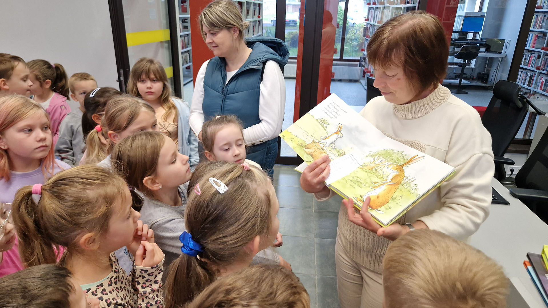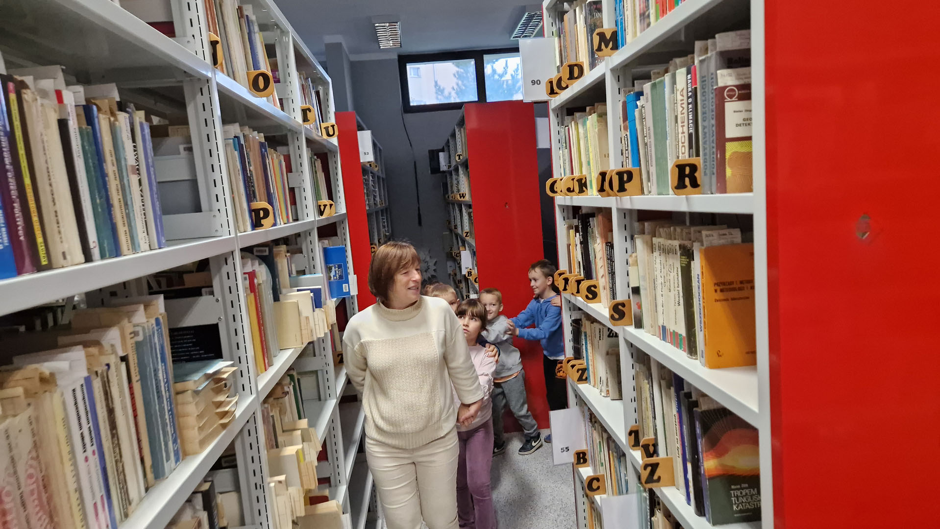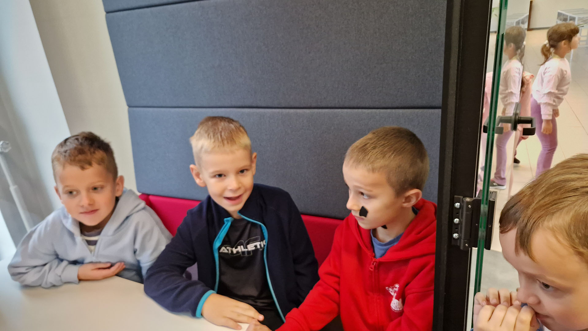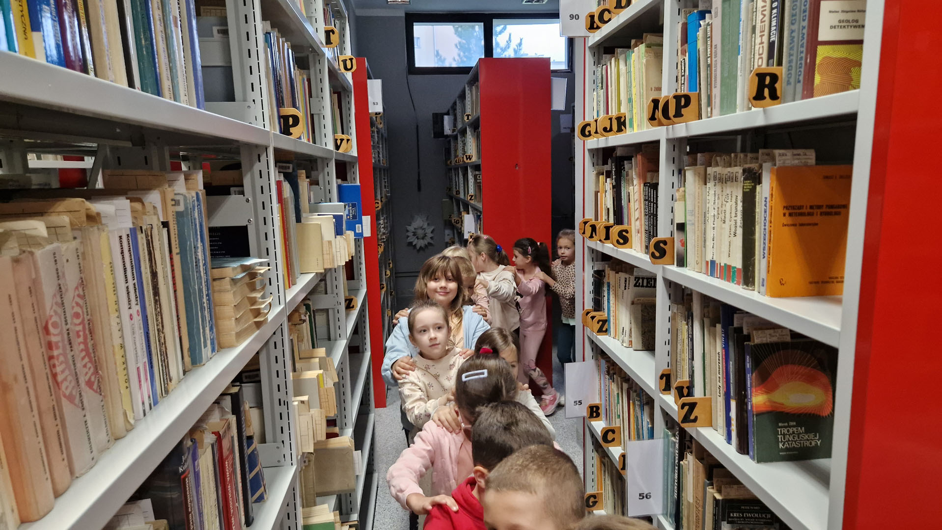 Pierwszym przystankiem była Biblioteka Pedagogiczna w Chełmie. Dzieci miały okazję zwiedzić to wyjątkowe miejsce i zobaczyć zakamarki, do których na co dzień nie można wejść. Żeby nikt się nie zgubił wśród wysokich regałów, pierwszaki utworzyły wesoły pociąg i wspólnie mknęły wśród regałów z książkami. Największe wrażenie zrobiły na nich książki, które po rozłożeniu kartek zamieniały się w zamek albo zaczarowany las. Dużą atrakcją okazały się też specjalne kabiny wyciszające, w których każdy mógłby spokojnie poczytać książkę lub czasopismo. Dieci dowiedział się że jest tyko dwie takie biblioteki w całym województwie lubelskim gdzie takie kabiny są. A obrazy w bibliotece? Uczniowie byli zdziwieni, że takie też tam są i można nawet zorganizować w bibliotece swój wernisaż.