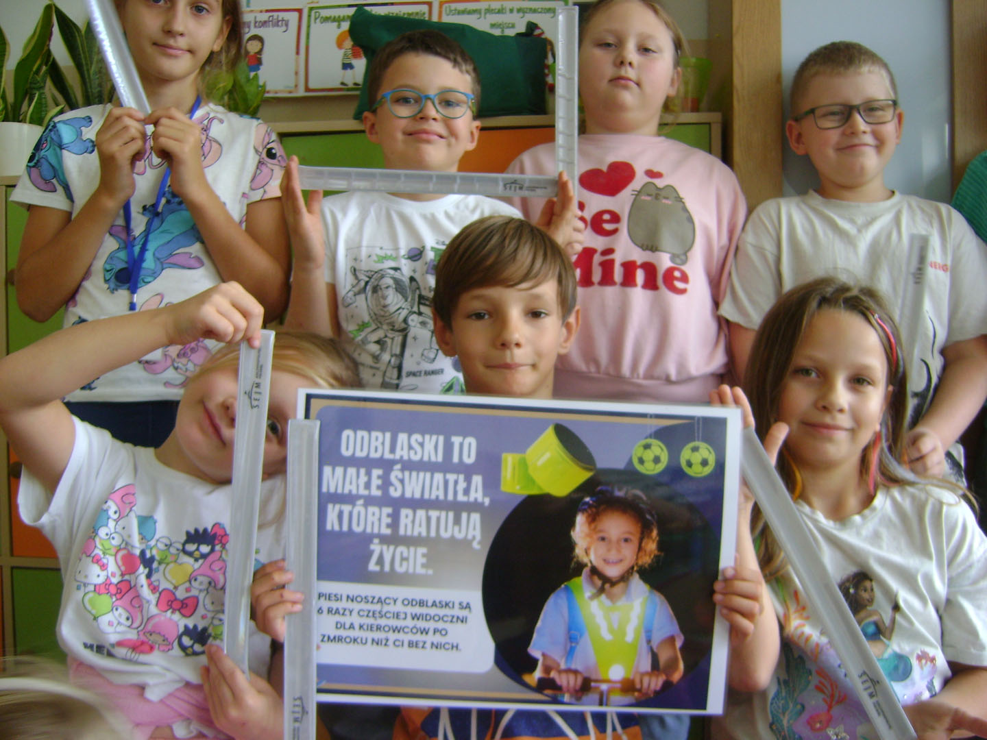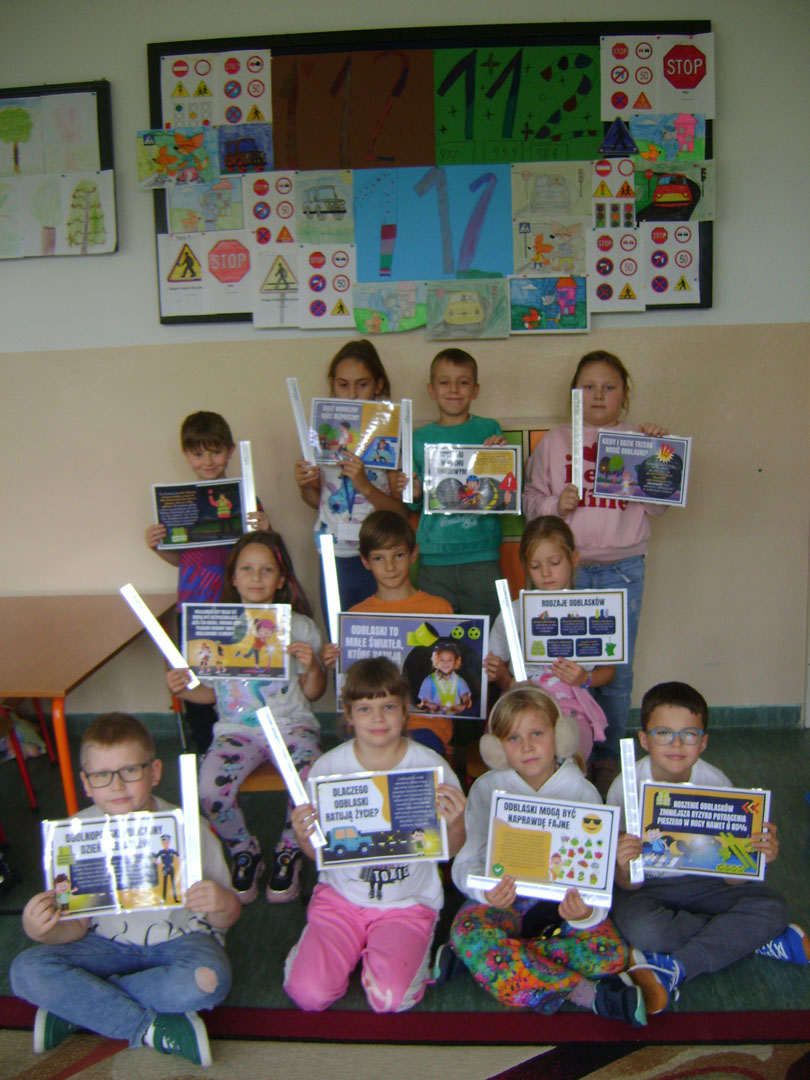 Uczniowie klas 1-3 w ramach zajęć świetlicowych poszerzają i utrwalają zasady bezpiecznego poruszania się po drodze, realizując w ten sposób założenia ogólnopolskiego konkursu „Odblaskowa Szkoła”. Świetliczaki przystąpiły do szkolnego konkursu plastycznego „Bezpieczeństwo w ruchu drogowym”, opracowały również gazetkę ścienną utrwalając znaki poziome i pionowe, zasady prawidłowego poruszania się po drodze, jak i numery telefonu alarmowego. O tym, jak ważne i potrzebne są odblaski dzieci mogły się przekonać podczas oglądania bajek oraz filmików edukacyjnych pokazujących widoczność pieszego w dzień i w nocy z odblaskami oraz bez nich. Nie zapomniały o odblaskach, które codziennie już noszą przy plecaku, począwszy od 1 października- „Ogólnopolskiego Dnia Odblasków”.