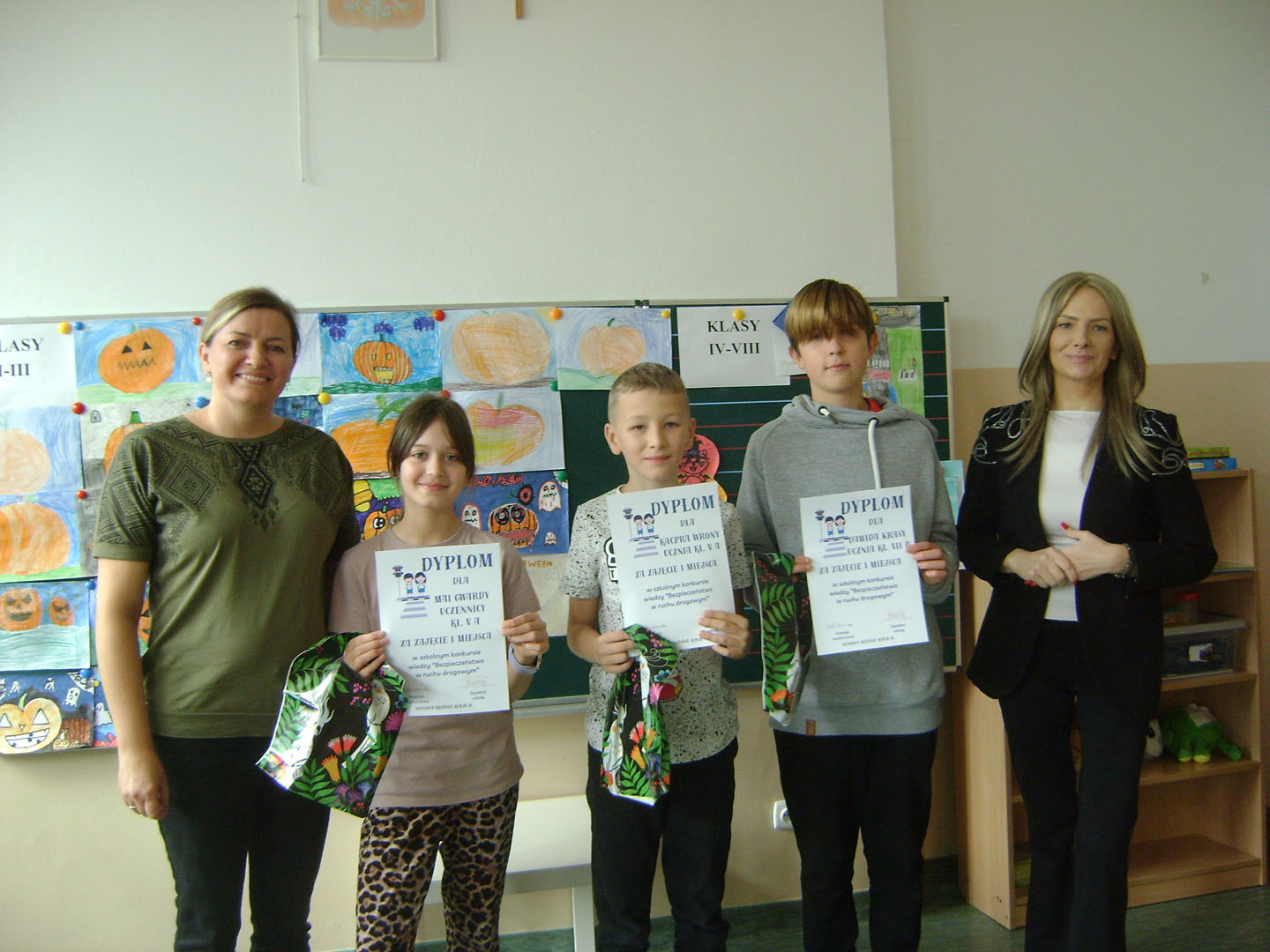 W środę, 12 listopada, został rozstrzygnięty ostatni konkurs w ramach realizacji zadań „Odblaskowej Szkoły”- test wiedzy o bezpieczeństwie w ruchu drogowym dla klas 1-3 oraz 4-8. Do zadań testowych przystąpiło 39 uczniów edukacji wczesnoszkolnej oraz 65 z klas starszych. Z rąk Pani Dyrektor dyplomy oraz nagrody za najwyżej punktowane prace otrzymali:
