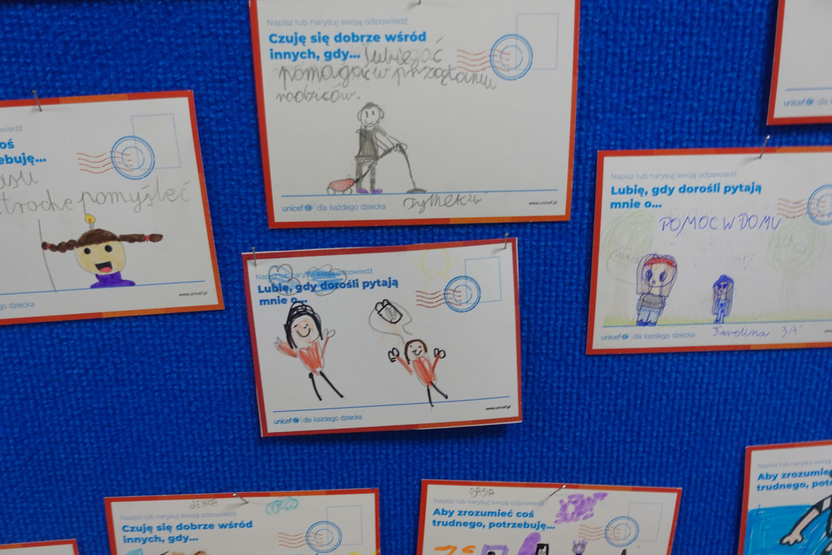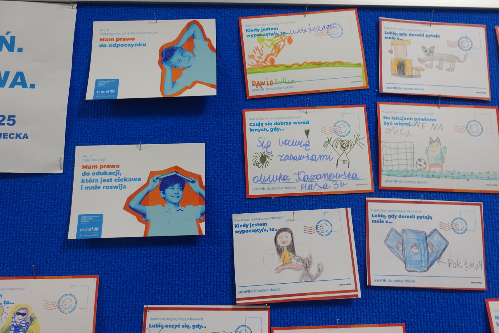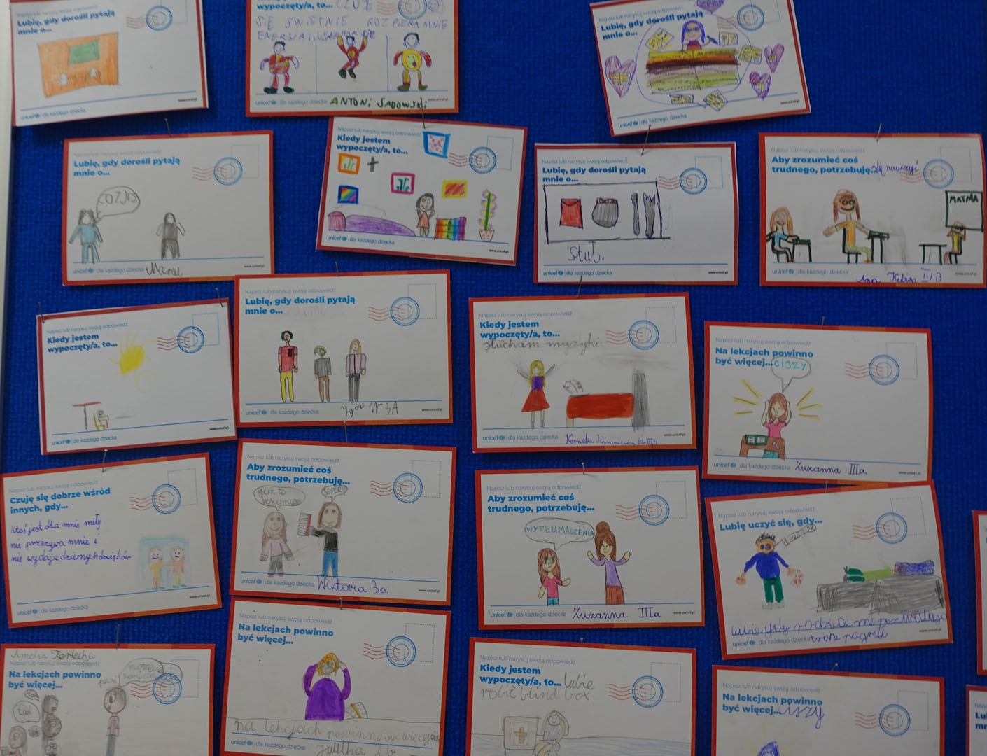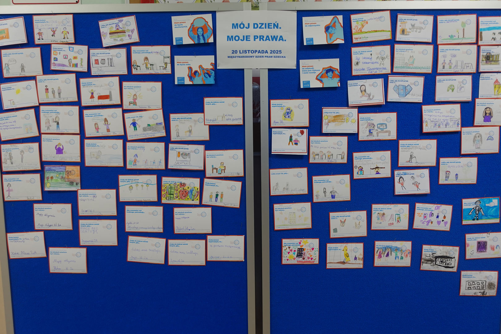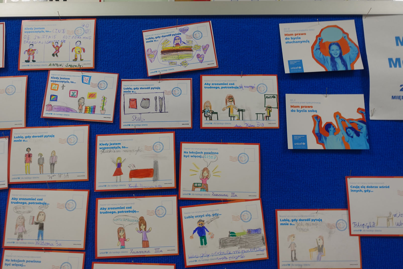 Dziś obchodzimy Międzynarodowy Dzień Praw Dziecka, który jest organizowany przez UNICEF – jedną z najważniejszych organizacji na świecie dbających o prawa najmłodszych. W bieżącym roku dzień ten jest obchodzony pod hasłem ,,Mam prawo do…”.Uczniowie naszej szkoły w tym dniu dzielili się swoimi spostrzeżeniami na temat praw dziecka rysując lub pisząc na specjalnie przygotowanych kartkach.