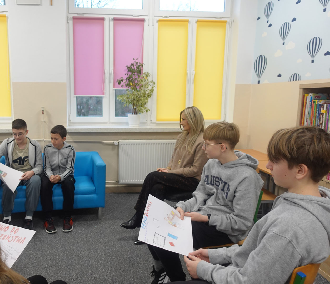 W dniu 3 grudnia odbyło się spotkanie przedstawicieli kl. VII b z Panią Dyrektor Katarzyną Czajką w ramach Klubu Szkół UNICEF. Spotkanie miało charakter podsumowujący Międzynarodowy Dzień Praw Dziecka i dotyczyło głównie praw dziecka w szkole. Podczas spotkania omawiano prawa dziecka w środowisku szkolnym. Uczniowie przedstawili swoje spostrzeżenia i uwagi odnośnie przestrzegania prawa do bezpieczeństwa, do nauki, odpoczynku i zabawy oraz wyrażania własnego zdania . Pani Dyrektor podczas rozmowy z uczniami podkreśliła, że szkoła jest zobowiązana zapewnić uczniom bezpieczeństwo fizyczne i psychiczne oraz przypomniała procedury zgłaszania sytuacji niebezpiecznych. W trakcie spotkania zostały też przedstawione propozycje rozwiązań, które w przyszłości zapewnią uczniom jeszcze lepsze warunki do nauki czy wyrażania własnego zdania. Na zakończenie spotkania uczniowie zostali zachęceni przez panią Dyrektor do zgłaszania ewentualnych problemów oraz propozycji dotyczących pozytywnych zmian w szkole.