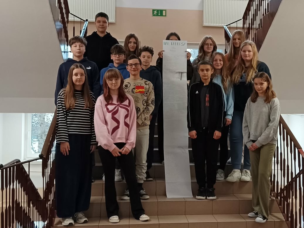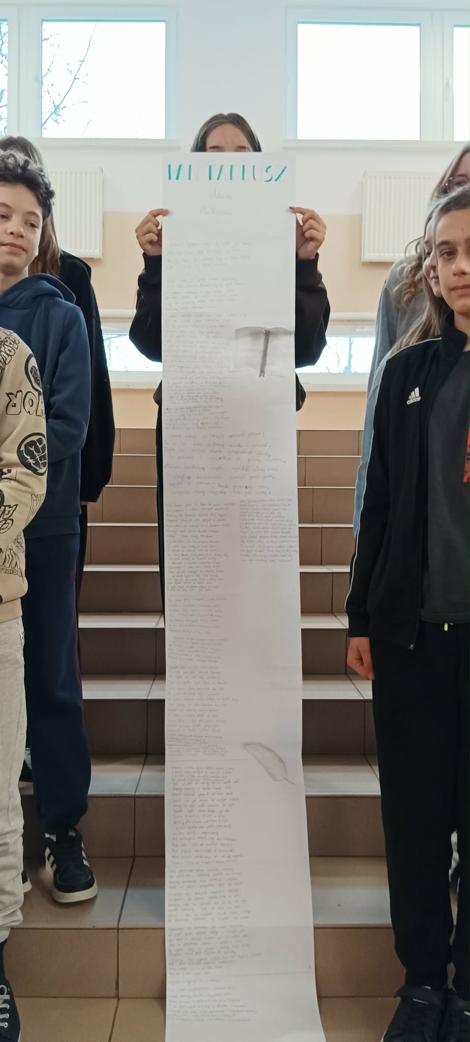 W ramach akcji zorganizowaliśmy maraton pisania ręcznego, w który zaangażowali się siódmo- i ósmoklasiści. Uczniowie mierzyli się z klasyką polskiej literatury, przepisując fragmenty „Pana Tadeusza” Adama Mickiewicza. Teksty zapisywane były na kartkach, które następnie połączono w jedną całość. Powstała w ten sposób oryginalna dekoracja korytarza szkolnego, ukazująca zarówno zaangażowanie uczniów, jak i piękno tradycyjnego pisma.