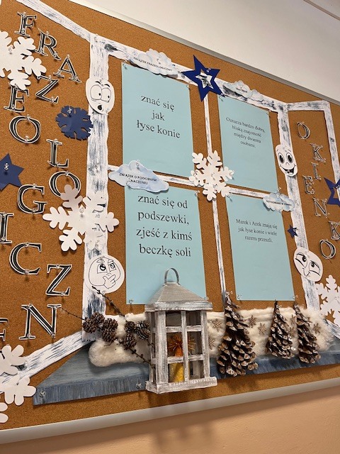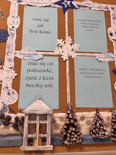 Raz w tygodniu na tablicy umieszczany jest nowy frazeologizm wraz z wyjaśnieniem i użyciem w zdaniu. Ponadto uczniowie mają możliwość poznania innego związku frazeologicznego, którego można użyć alternatywnie.