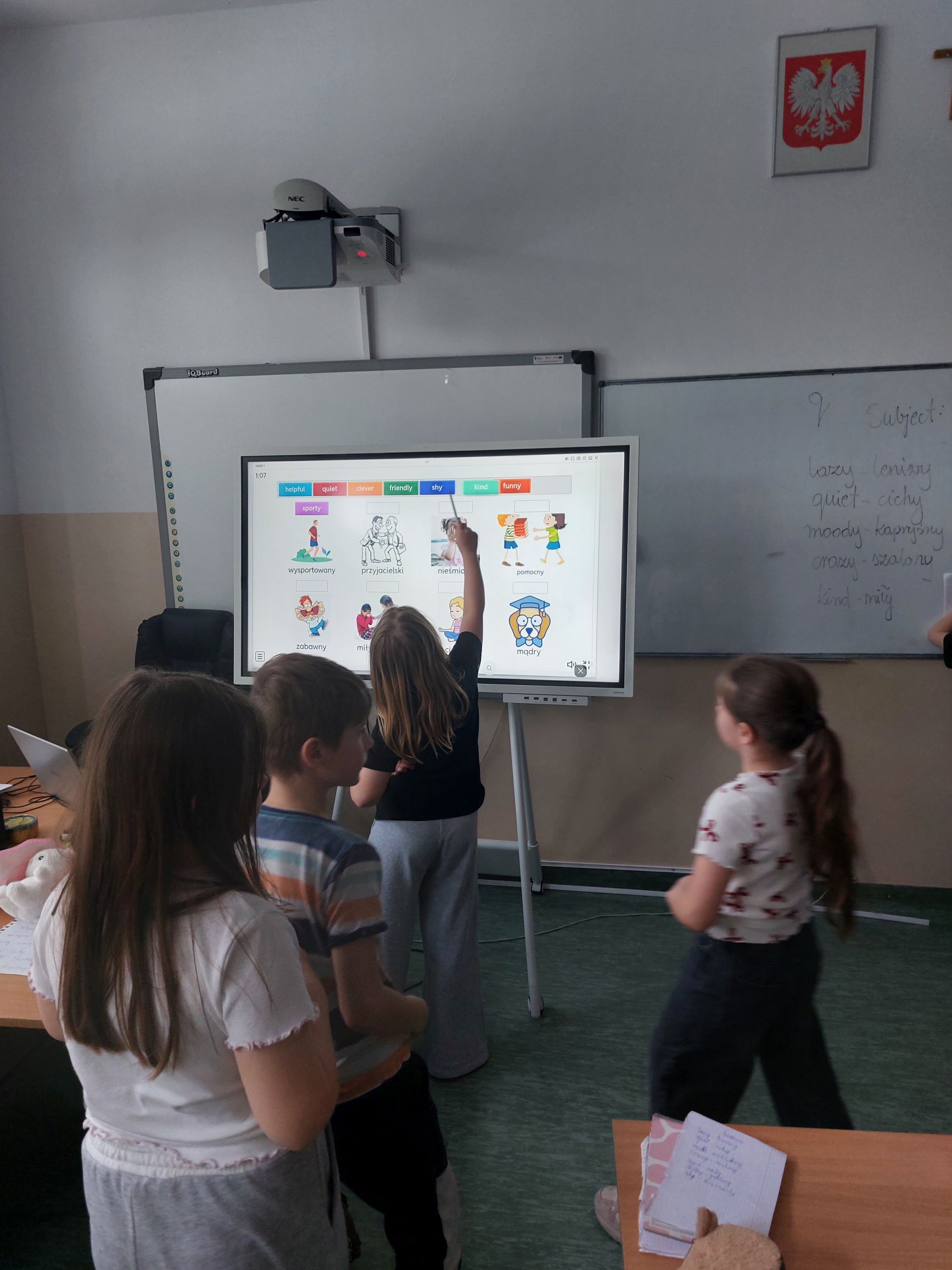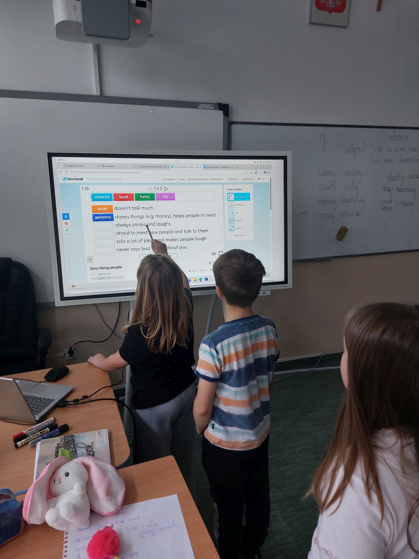 Systematyczne wykorzystywanie TIK w projekcie edukacyjnym znacznie uatrakcyjnia zajęcia, a tym samym aktywizuje uczniów do intensywnej pracy. W ostatnim tygodniu I semestru realizowano na zajęciach zagadnienia związane z opisywaniem wyglądu oraz cech charakteru człowieka. Uczniowie byli bardzo zaangażowani w wykonywanie różnorodnych zadań interaktywnych, a przy okazji okazywali sobie wzajemne wsparcie w przypadku napotykania na różnego rodzaju trudności.