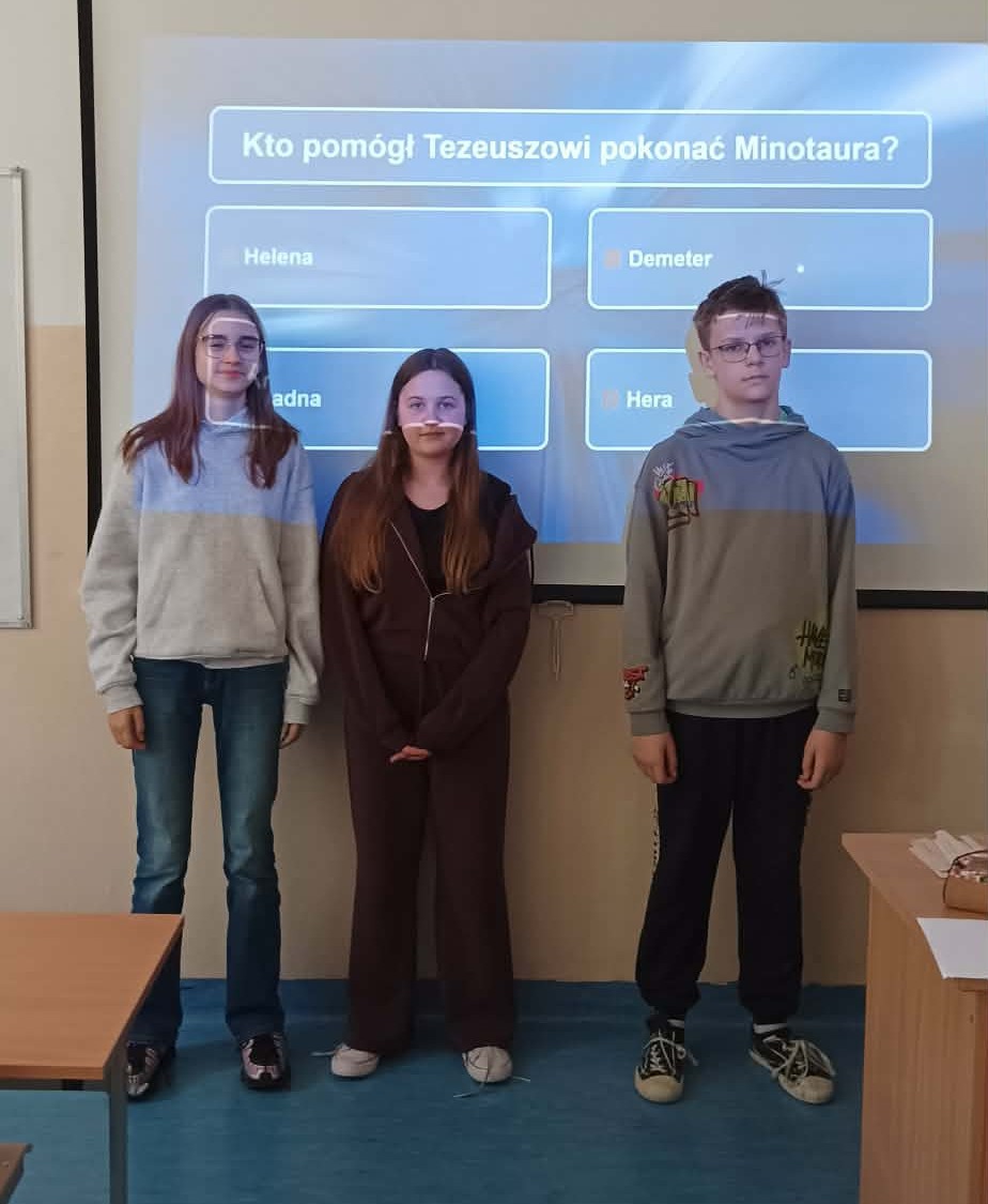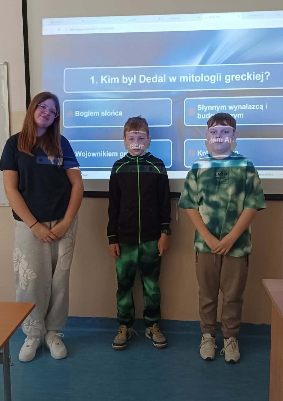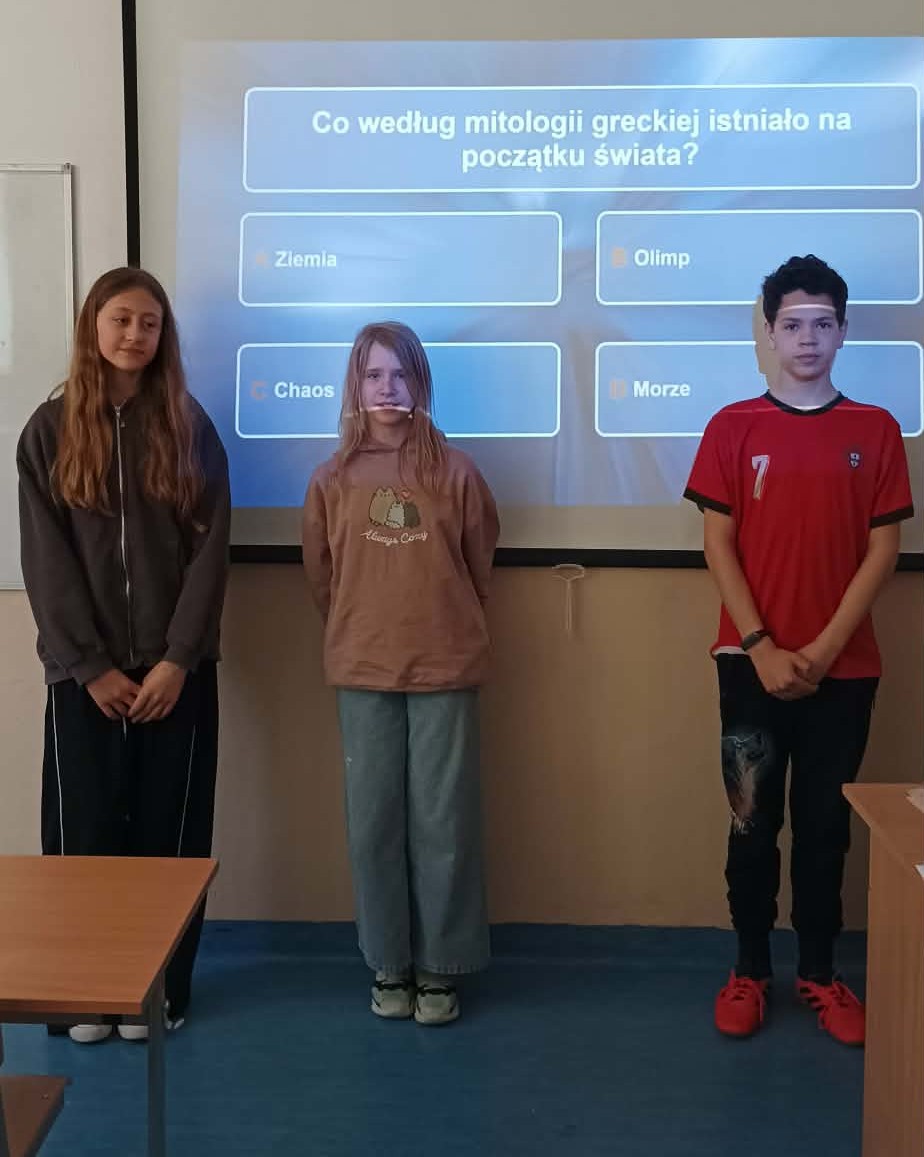 13 kwietnia w naszej szkole odbył się konkurs mitologiczny dla uczniów klasy 5, który dostarczył uczestnikom wielu emocji i dobrej zabawy. Uczniowie zostali podzieleni na 6 grup, a każda z nich miała za zadanie zmierzyć się z pytaniami dotyczącymi mitologii. Konkurs został przeprowadzony w formie popularnej gry „Milionerzy”. Każda grupa otrzymała inny mit, na podstawie którego przygotowane były pytania. Uczniowie musieli wykazać się wiedzą, spostrzegawczością oraz umiejętnością współpracy w zespole. Rywalizacja była bardzo wyrównana, a uczestnicy z dużym zaangażowaniem odpowiadali na kolejne pytania, starając się zdobyć jak najwyższe kwoty w grze. Nagrodą za udział w konkursie były oceny, uzależnione od kwoty wygranej w „Milionerach”, co dodatkowo motywowało uczniów do jak najlepszych wyników. Wydarzenie przebiegło w miłej atmosferze i było świetną okazją do nauki poprzez zabawę.
